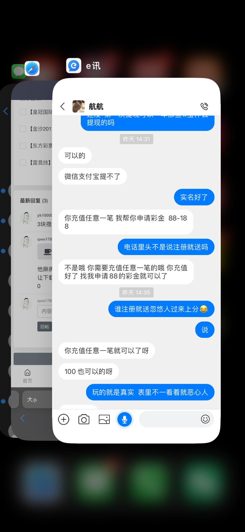 他麻痹我三个手机号收到这个特邀  打电话说注册送 让下载e讯里面的客服全是充值才送  我还在里面输600