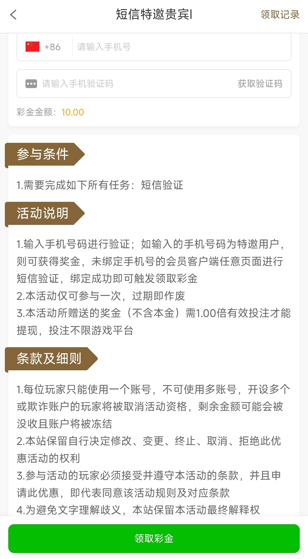 注册好绑定手机号后到优惠里领取彩金,一倍流水,没说有游戏限制