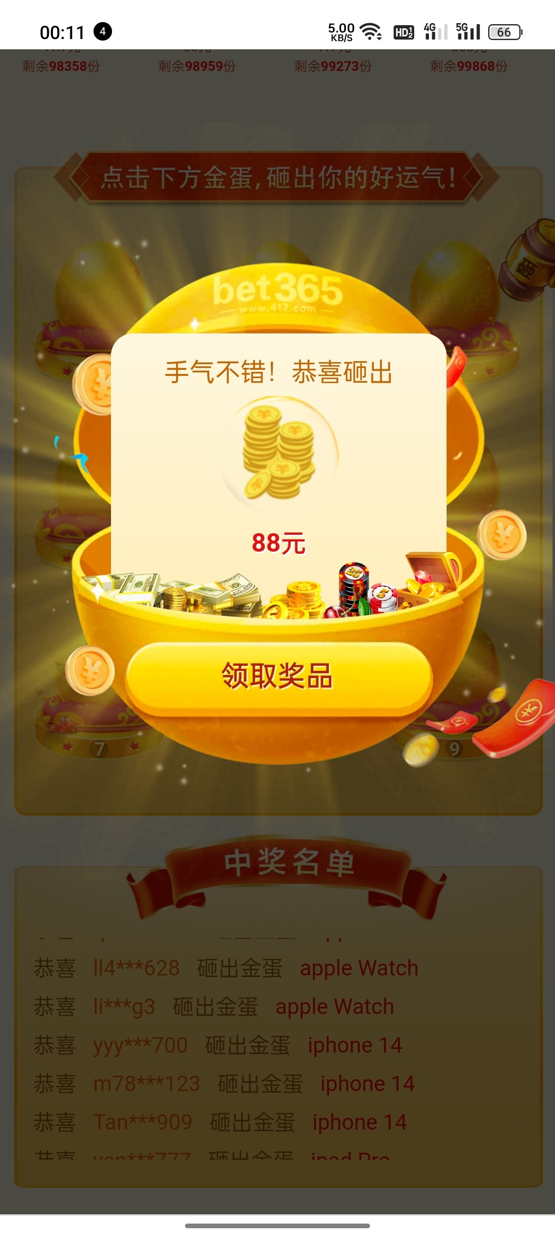两个号 一个砸中41一个砸中88 明天18号还有41派送 感谢楼主!