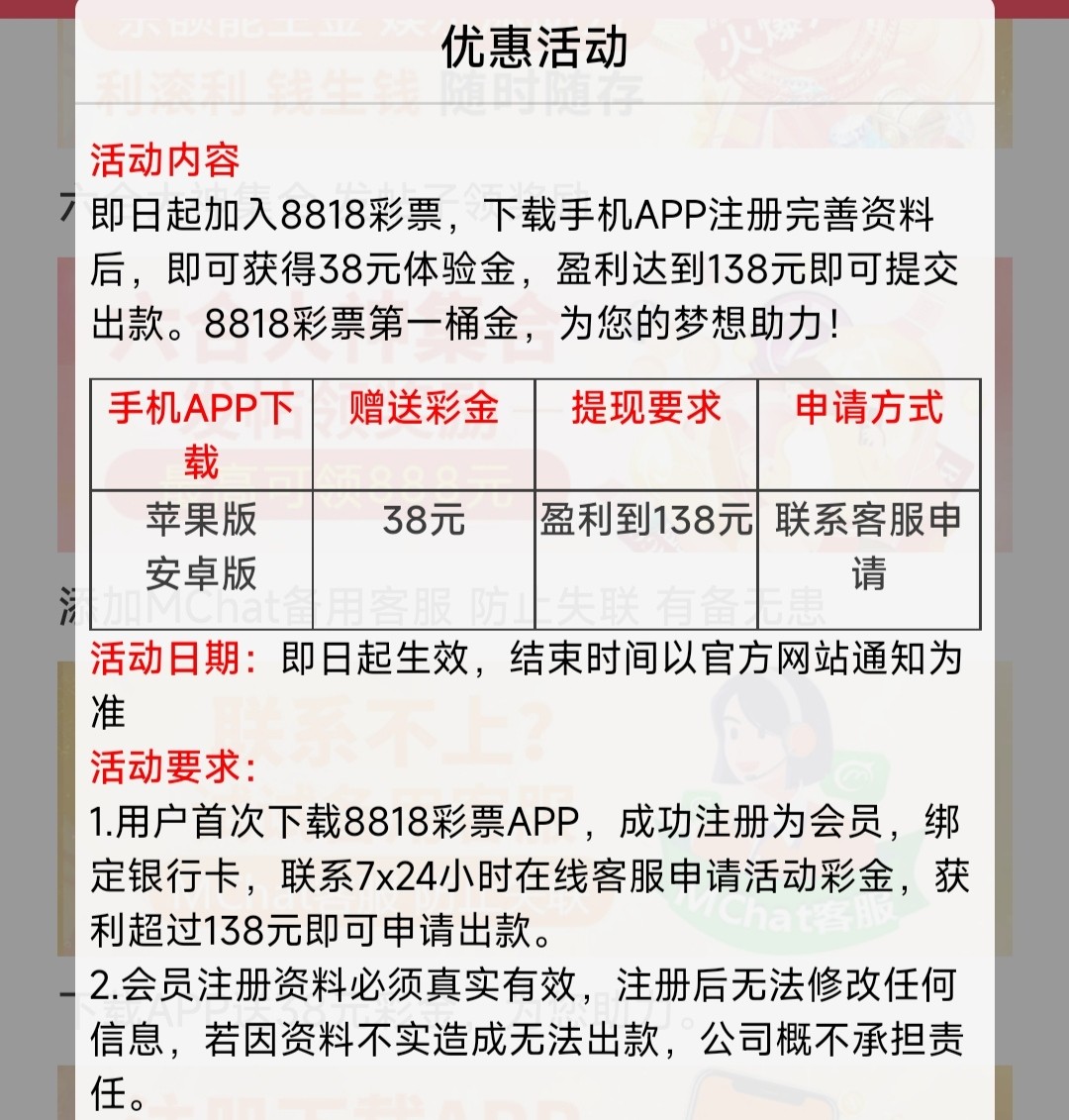 下载手机APP注册完善资料后,即可获得38元体验金,盈利达到138元即可提交出款。建议换干净ip再去