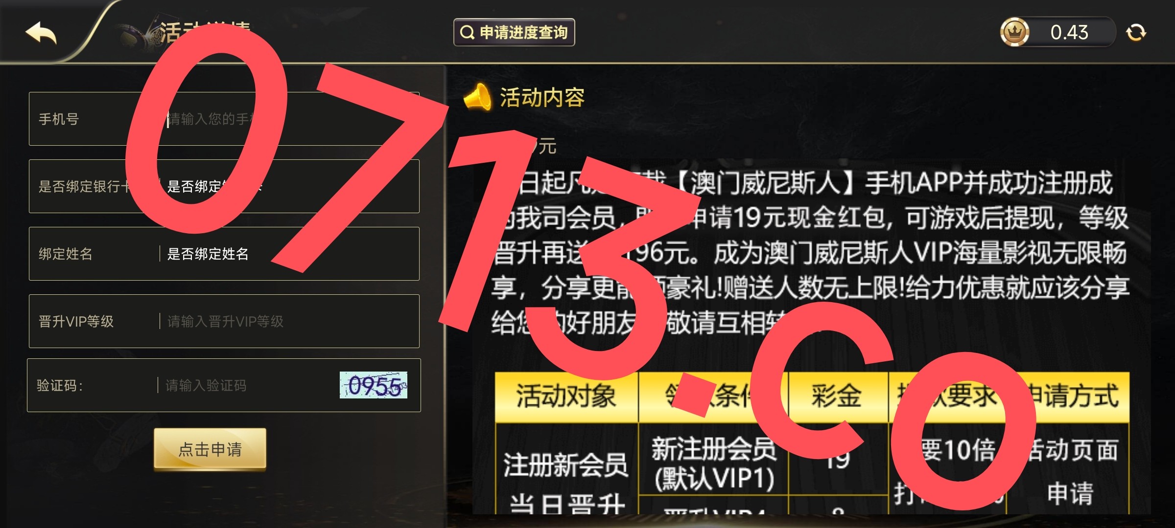新用户下载APP注册自助申请送19彩金,要10倍流水提现,具体自测!