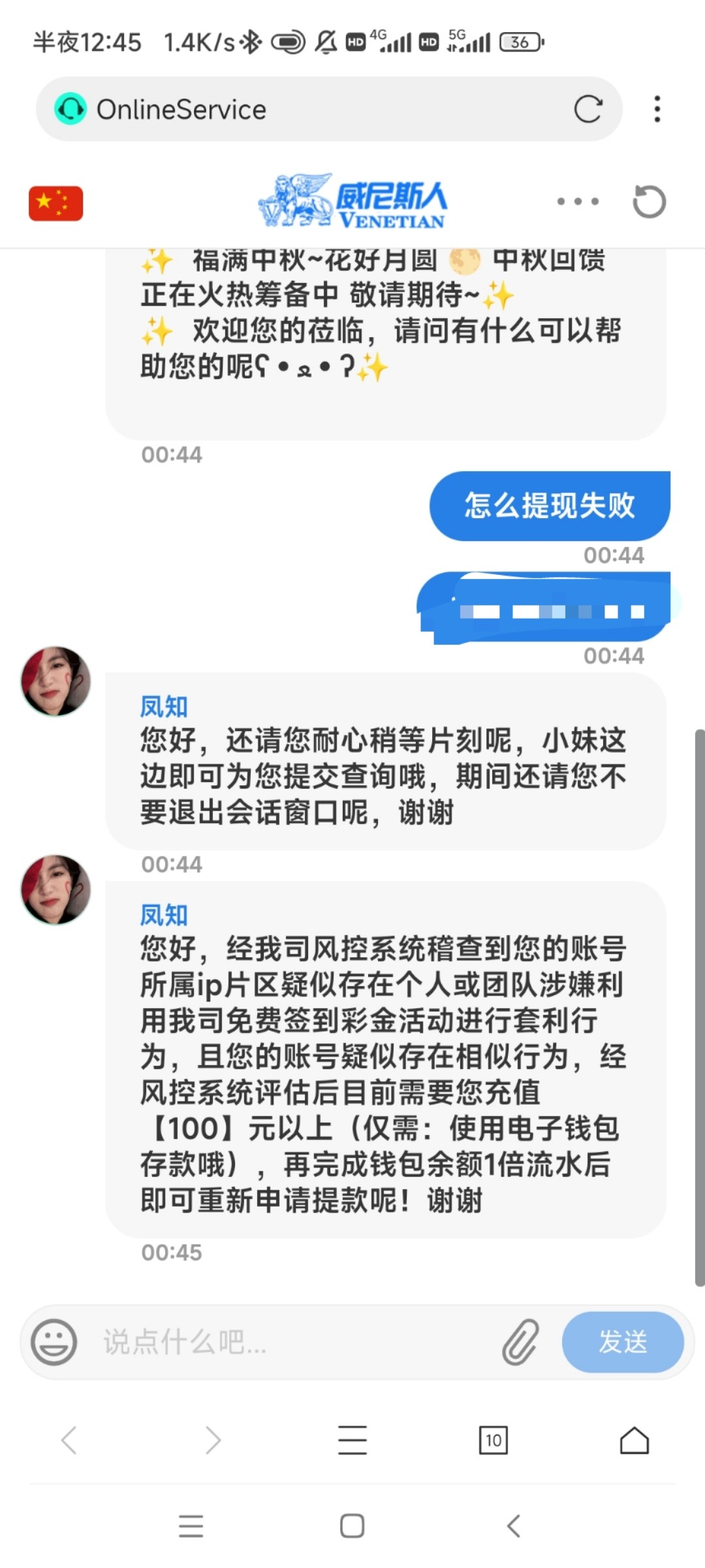 您好,经我司风控系统稽查到您的账号所属ip片区疑似存在个人或团队涉嫌利用我司免费签到彩金活动进行套利行为,且您的账号疑似存在相似行为,经风控系统评估后目前需要您必须使用【电子钱包】充值【100】元以上,再完成钱包余额1倍流水后即可使用您本人实名认证的钱包钱包重新申请提款,谢谢
