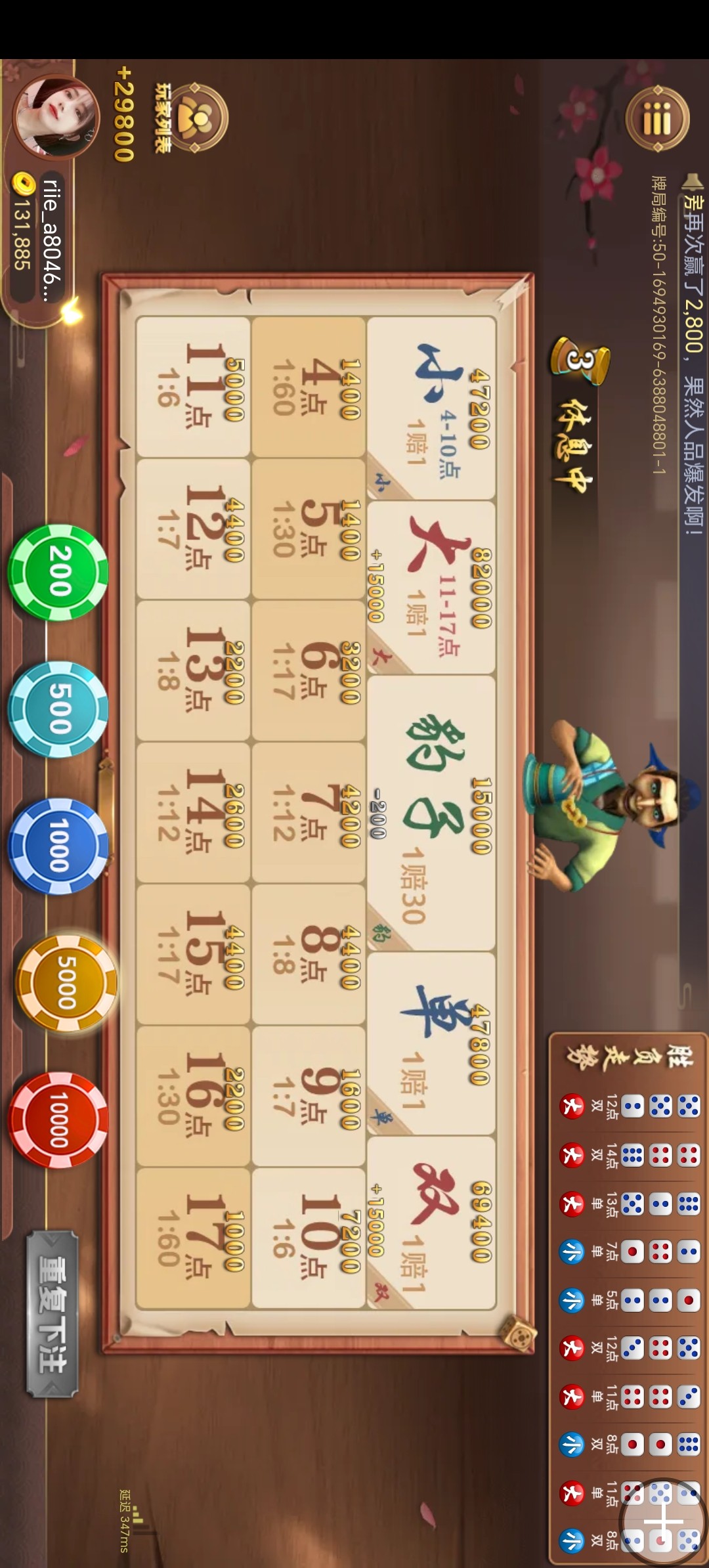 一边买大,一边买双啊,就这样子,玩了差不多两小时