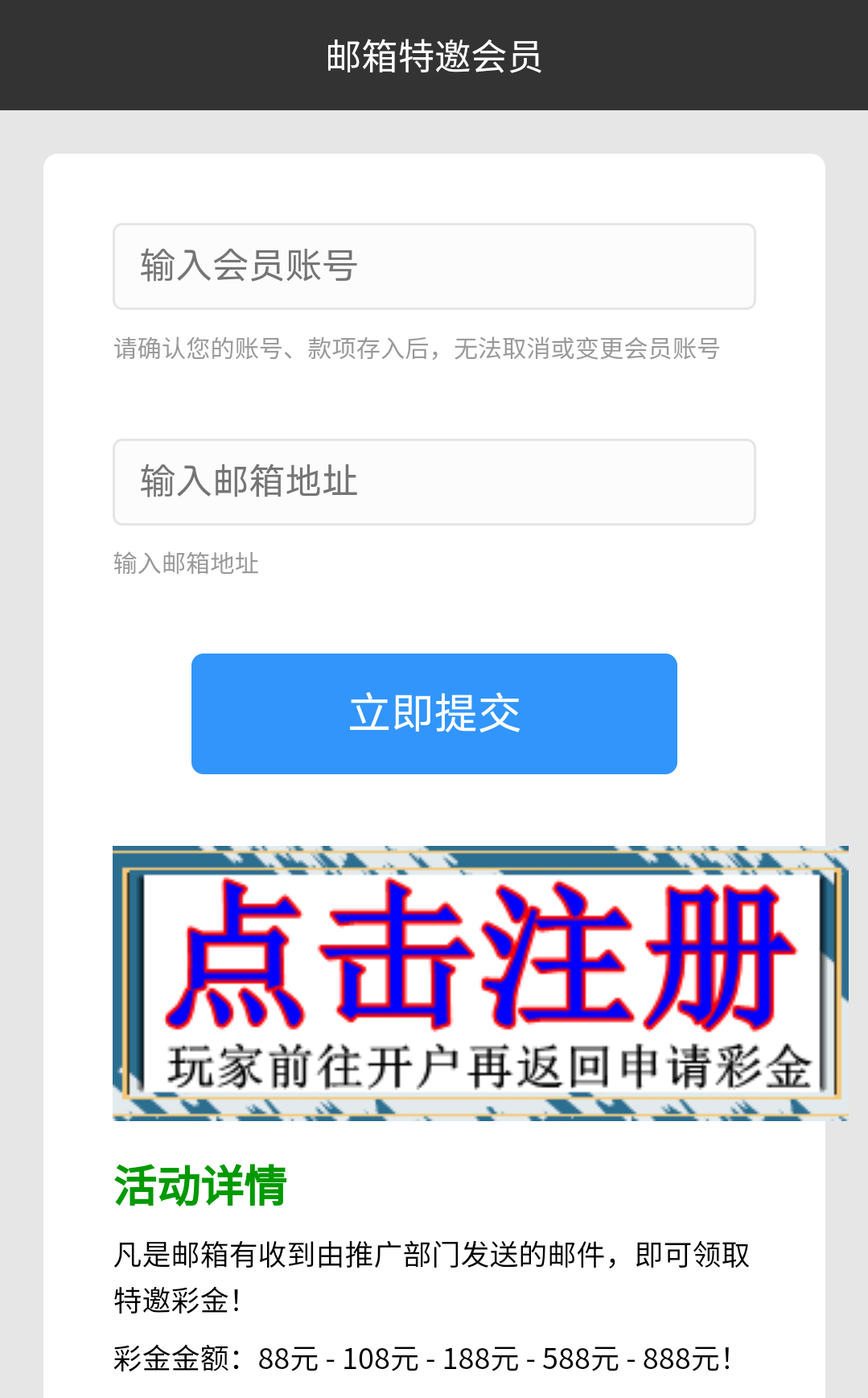 亲, 提交提示邮箱已领取,说明邮箱号信息历史提交过呢,无法二次申请此活动的呢,还请您进入我司网站【优惠活动】了解关注其他诸多【优惠豪礼】喔,公司入款3%优惠 线上入款 0.5%优惠 ,笔笔充笔笔送哦!电子第七惠:【以小博大】活动单笔充值【108】送 【58 】或【50】赠送【38】! 取款无上限喔!