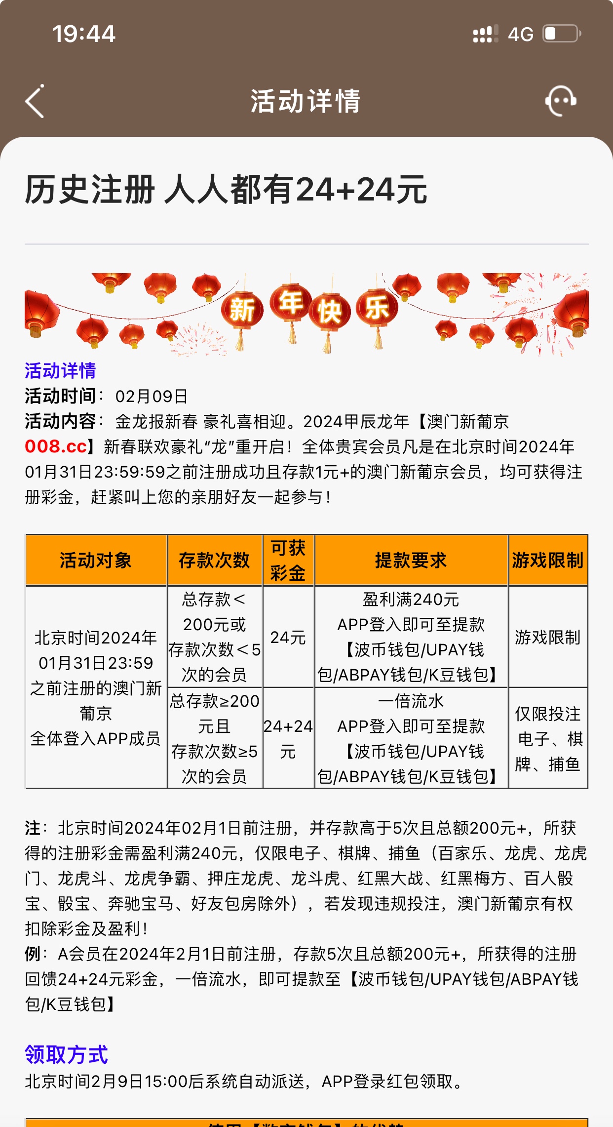 新用户无视!老用户2月1号前注册过可以领24,历史充值200+领24+24,2月9号登陆游戏进行领取