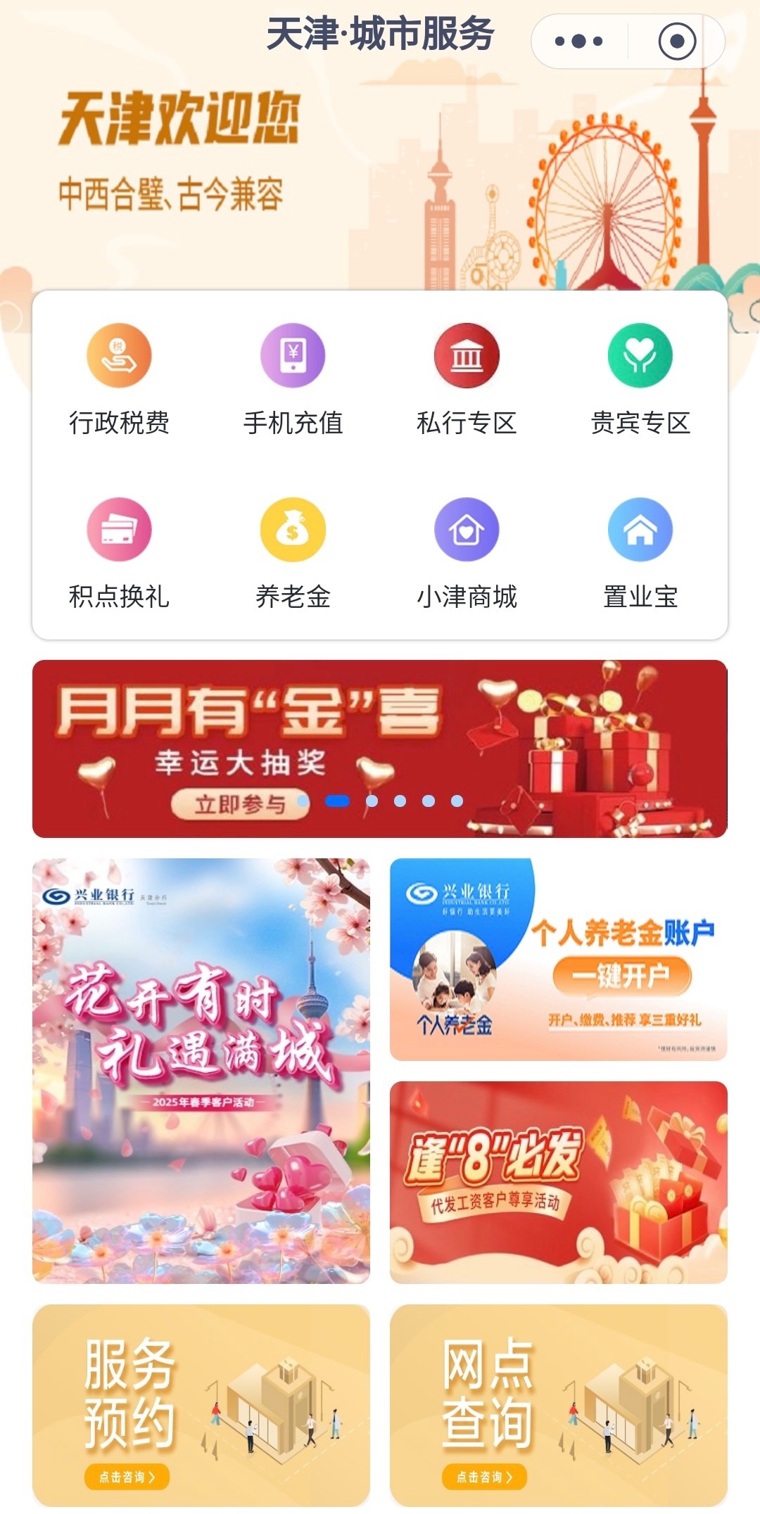 首页,下拉城市服务选择天津,横幅左右滑动点月月有惊喜
