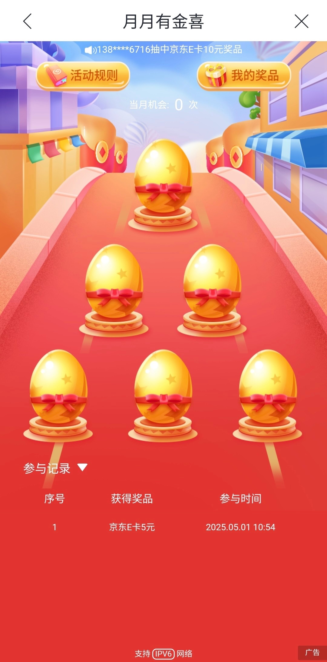 每个月只能中奖一次,不中第二天再去。e卡打开链接就显示卡号卡密了