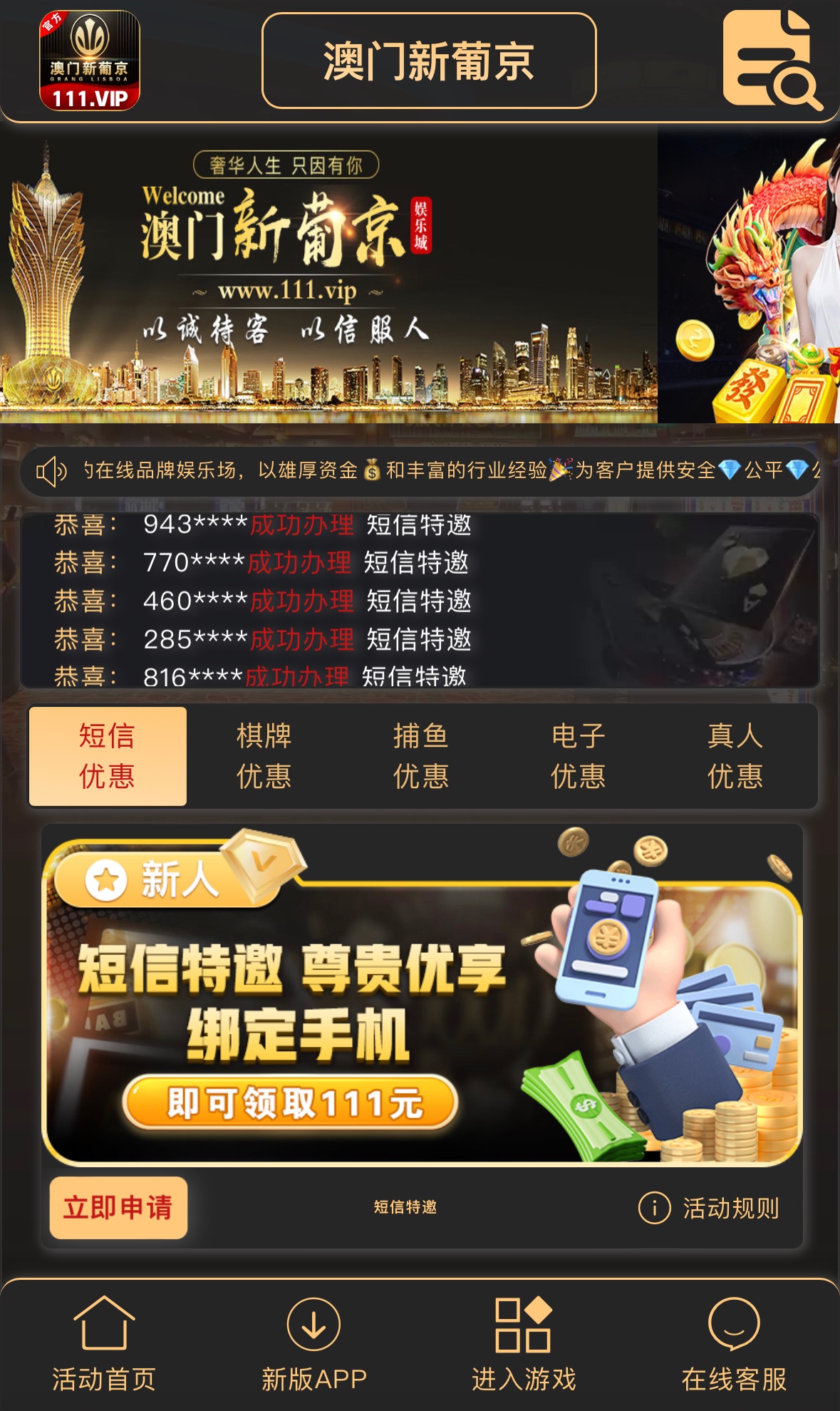 短信特邀碰瓷,注册完善资料优惠大厅申请彩金