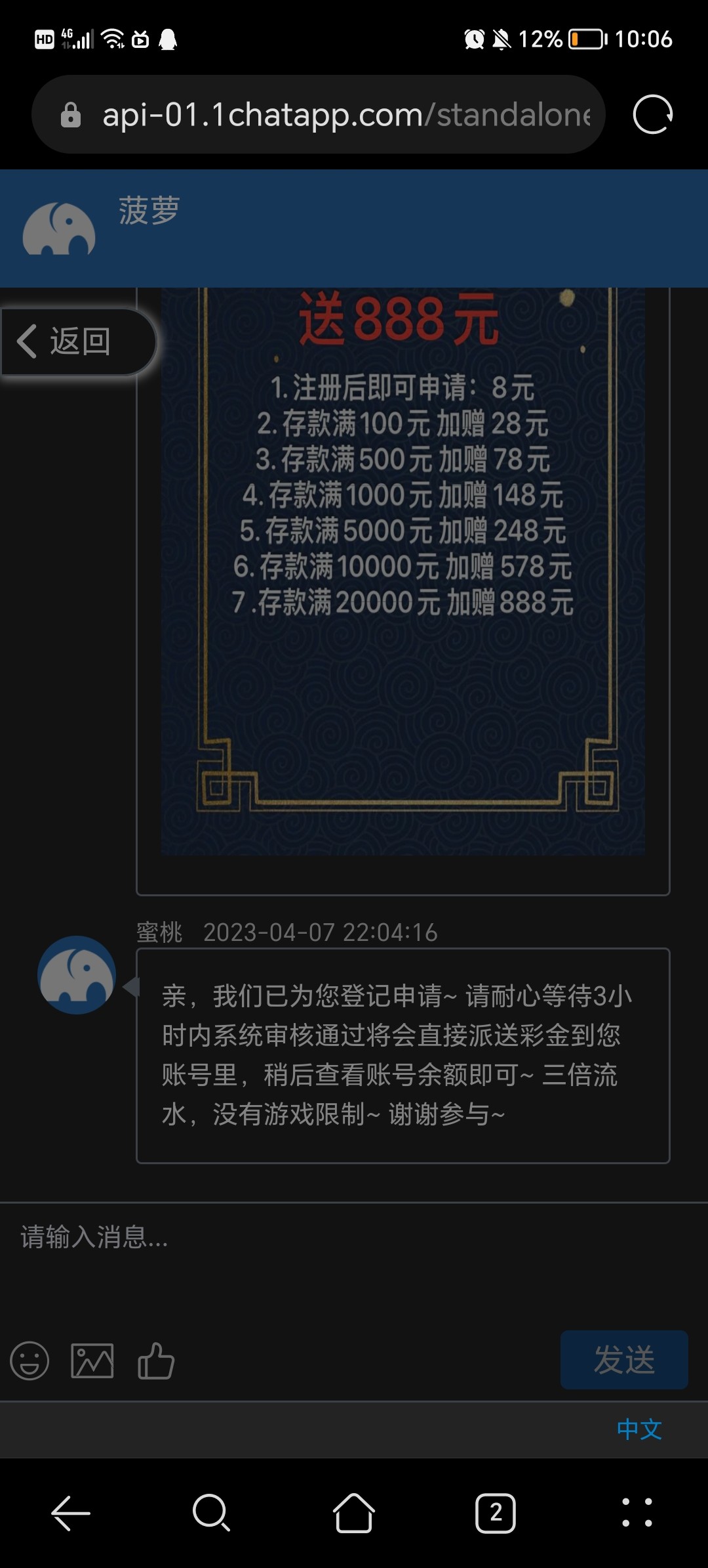 第一次提160多说这8元彩金只能提款100,后面我提款也给我退回来,理由是系统检测注单异常,让我第二天找客服,我找个鸡巴这种套路太多了,直接扔pg电子了
