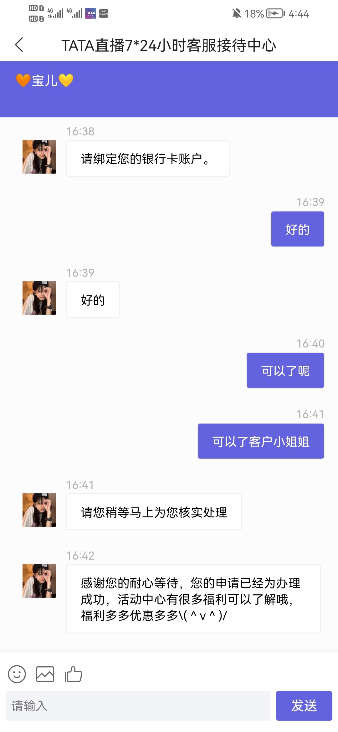 TATA注册说28彩金新人注册绑定银行卡去找客户领取28彩金。今天领不到的,第二天还可以申请一次