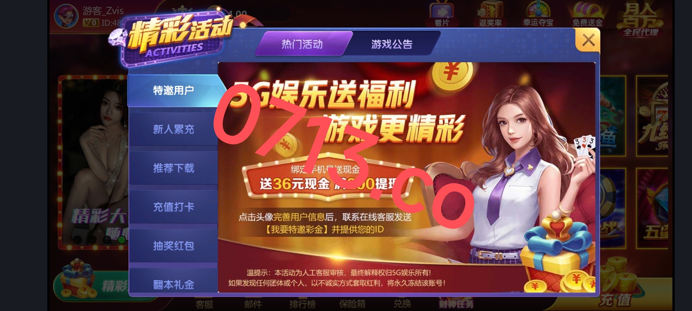 新用户注册绑卡绑定手机号 联系在线客服发id申请36彩金 这个台子跟贪玩系列有点类似 特邀碰瓷 不送就不是特邀 无视即可 无游戏限制